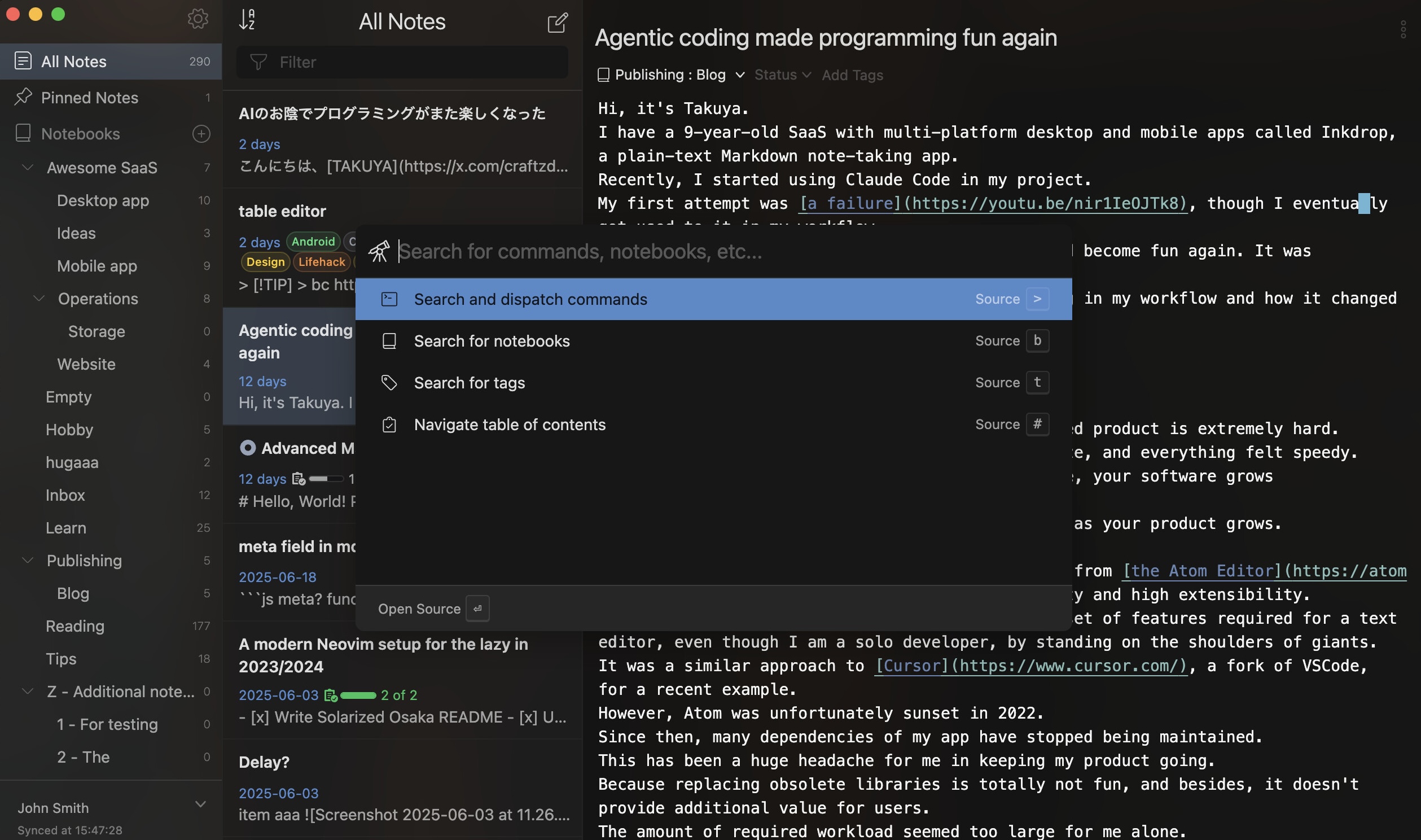 Inkdrop is an app for technical notes by Takuya Matsuyama. It's hard for me to nitpick Inkdrop because Matsuyama is an inspiration to me. His work and story regularly inspire me and sets a standard for just what a solo dev can do.