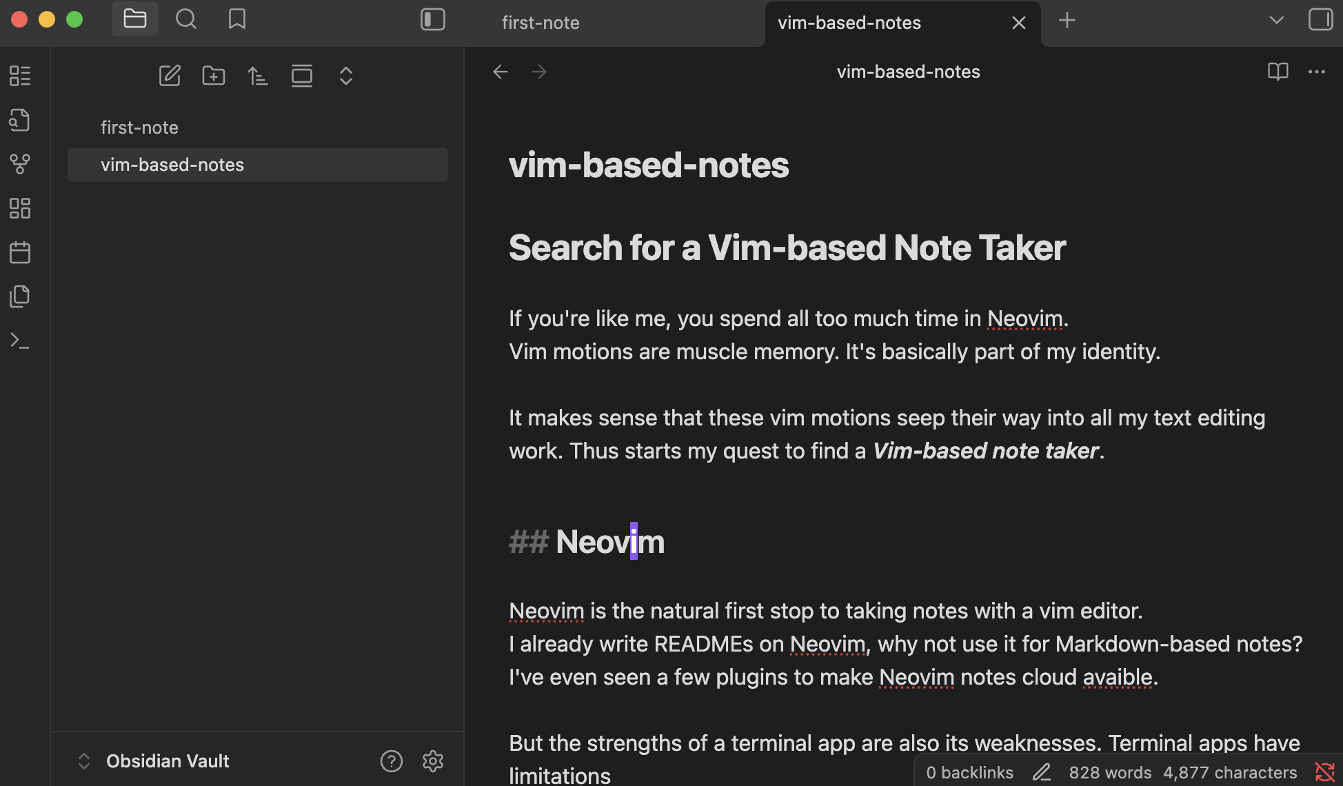 Obsidian is a beloved notes and knowledge app. I love Obsidian's local-first philosophy and it did support vim! That being said, Obsidian in my opinion is a local desktop notes app built for general audiences first, and not built for vim users first.