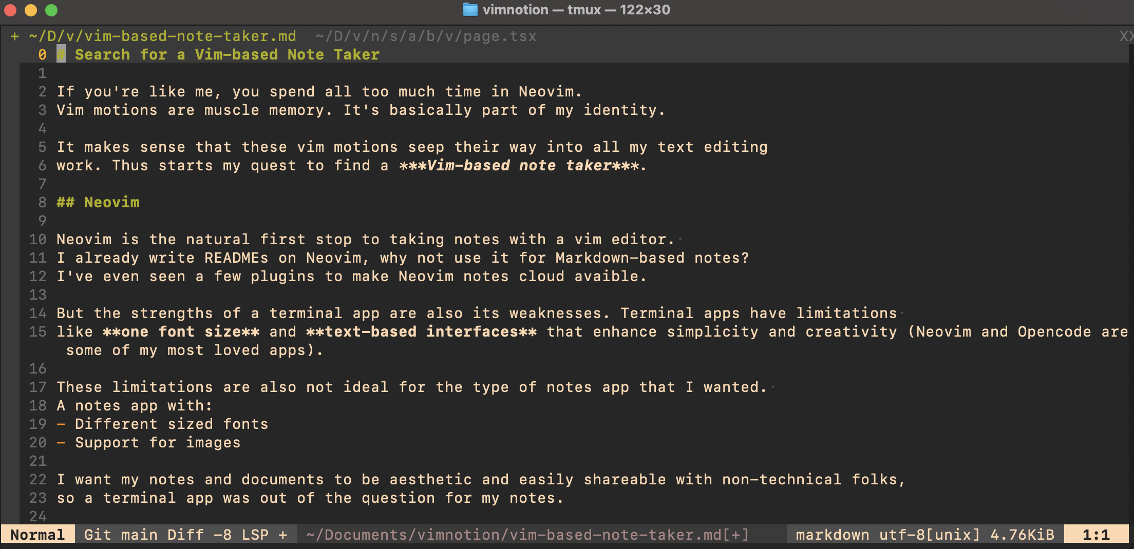 I realized that there's a difference between a notes app with vim bindings and a truly Vim-first notes app. I wanted the latter. I wanted my fingers to fly.