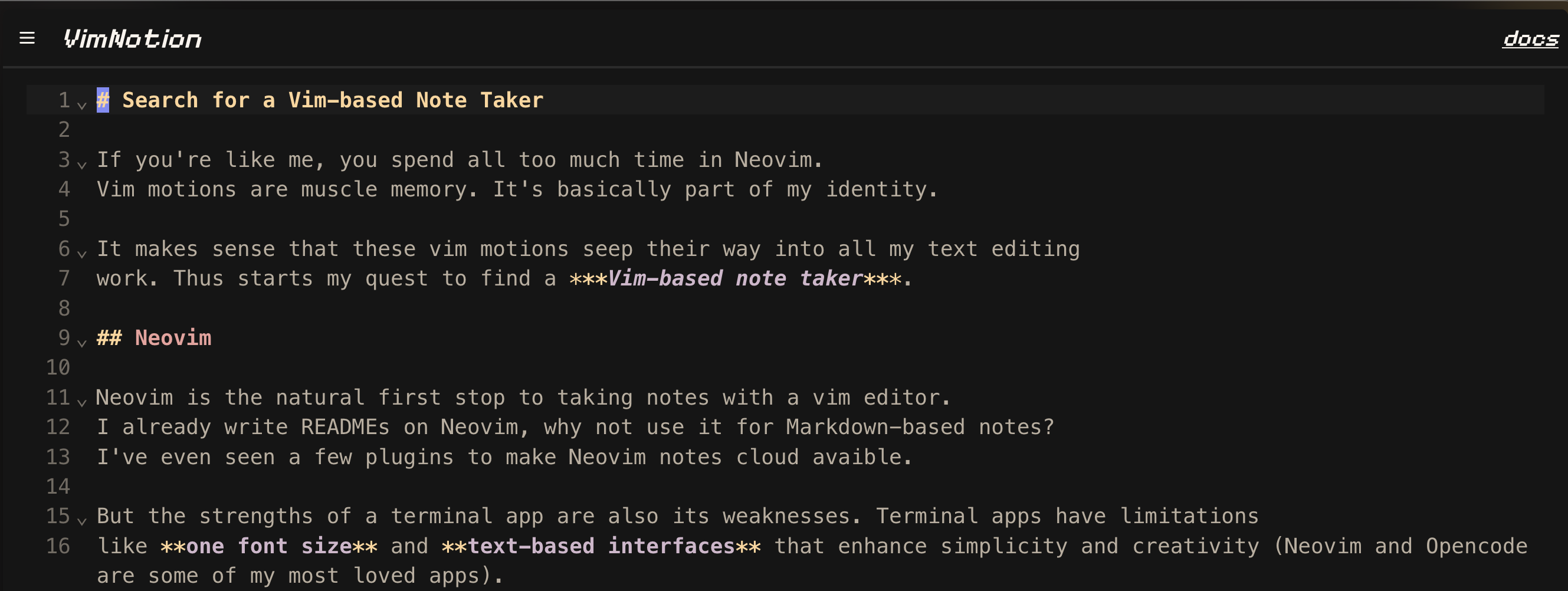 VimNotion is monospaced, with consistent font, font sizes, and line numbers. Your fat cursor in normal mode can fly across your doc. It's almost like you're working in Neovim in your terminal.