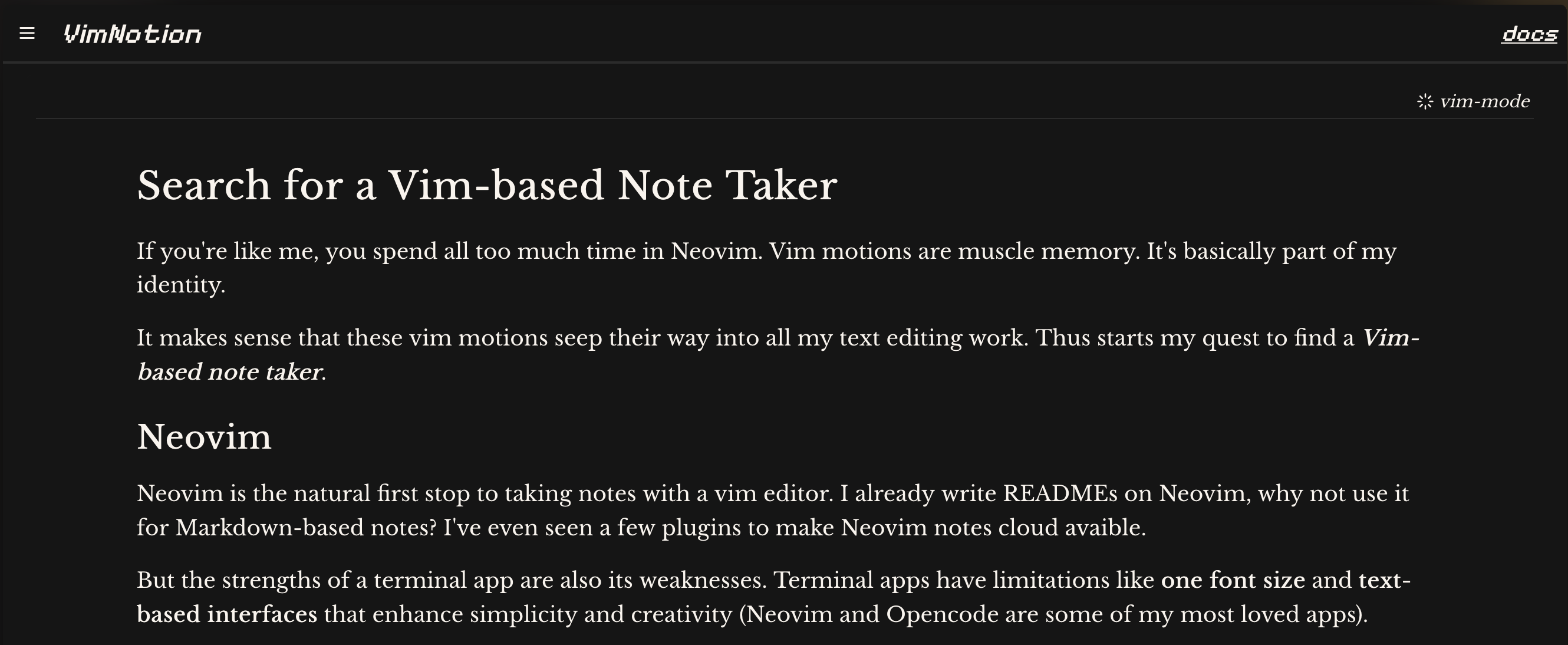 Obsidian is a beloved notes and knowledge app. I love Obsidian's local-first philosophy and it did support vim! That being said, Obsidian in my opinion is a local desktop notes app built for general audiences first, and not built for vim users first.